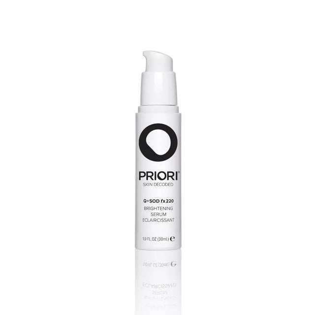 The Priori Q+SOD fx220 Brightening Serum is a professional-grade superceutical that harnesses advanced adaptive technology to visibly address uneven skin tone and hyperpigmentation. This intelligent brightening treatment features Priori's proprietary Q+SOD Complex, combining CoQ10 (Ubiquinone), Superoxide Dismutase (SOD), 15% Lactic Acid, and 0.15% Retinol in a clinically-proven formulation that works in real-time to deliver precisely what your skin needs.